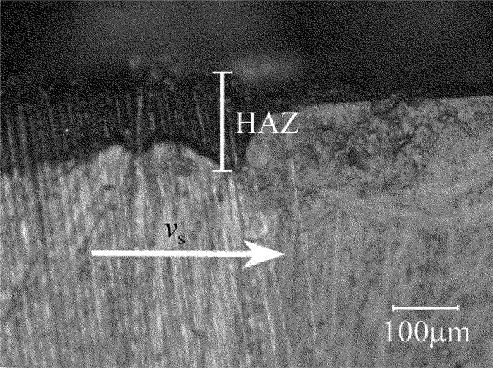 在激光功率為60W、重復頻率為0.4MHz、掃描速率為1m/s時,CFRP表面熱影響區如圖 4所示。從圖中可以看出,CFRP表層纖維的排布方式對熱影區有顯著影響,當掃描方向與表層纖維排布方向垂直時,熱影響區達70μm;當掃描方向與纖維排布方向一致時,材料表面幾乎沒有熱影區。主要是因為碳纖維的熱傳導率遠遠大于環氧樹脂的熱傳導率,未能達到CFRP燒蝕閾值處的脈沖能量沿著碳纖維方向傳播,所以當掃描方向與表層纖維排布方向一致時,沿著掃描方向傳播的能量與下一個脈沖能量共同用于去除CFRP材料,掃描深度也更大,對切縫兩側造成熱影響區較?。欢敀呙璺较蚺c表層纖維排布方向垂直時,能量沿著掃描垂直方向傳播,切縫兩側熱量累積,對CFRP造成熱損傷,導致嚴重的熱影響區。