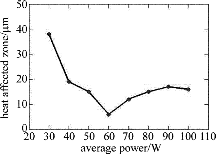 圖 5是當重復頻率為0.4MHz、掃描速率為10m/s時,平均功率與熱影響區的關系。由圖 5可以看出,當平均功率增加時,熱影響區逐漸減小,隨著平均功率的繼續增加,熱影響區逐漸增大,最后趨于穩定。由于在重復頻率、掃描速率不變時,隨著平均功率的增加,單脈沖能量也增大,達到材料燒蝕閾值的能量也更多,激光脈沖能量更有效地用于CFRP的去除,有利于提高單脈沖能量的利用率,使得熱損傷相應的減小,從而熱影響區減小。然而,當功率過高時,去除材料后剩余的能量也越多,導致能量的積累越多,使得熱損傷相應的增加,從而熱影響區增大。由圖 5可知,當平均功率為60W時,此時熱影響區小,約為5μm。