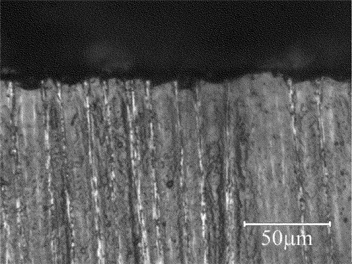 基于以上優化的工藝參量,在激光功率為60W、重復頻率為0.4MHz、掃描速率為10m/s時,CFRP邊緣表面的形貌如圖 8所示。由圖可以看出,邊緣表面熱影響區非常小。