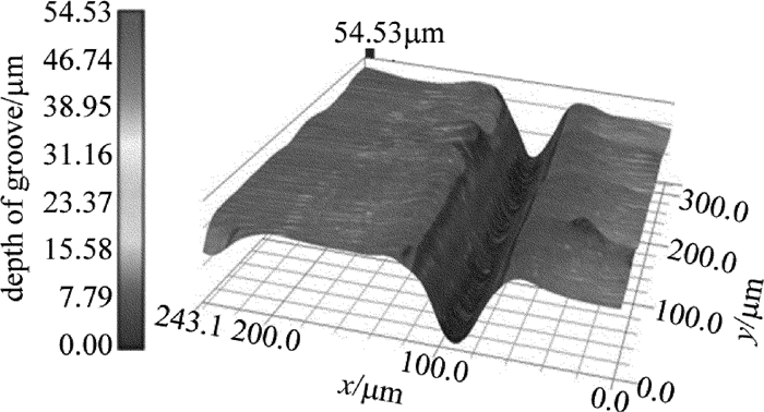 為了得到合適掃描深度,探究了循環掃描次數對掃描深度的影響規律,在上述實驗的基礎上選擇合適的工藝參量:平均功率60W、重復頻率0.4MHz、掃描速率10m/s,選取循環掃描次數分別為3, 5, 10, 20, 50, 100進行實驗,通過超景深3維顯微鏡來測量其掃描深度和寬度。圖 9為掃描次數為20時切縫微觀形貌的分層設色圖。圖中顏色由灰色向黑色過渡表示掃描深度的增加,黑色表示掃描深度較大,由圖可以看出,此時掃描寬度為50μm左右,深度約為40μm。