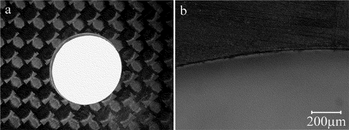 圖 11a和圖 12a分別是在優化工藝參量下對1.5mm厚碳纖維板進行直線、圓孔切割的實驗結果;圖 11b和圖 12b分別是對切割后直線、圓孔邊緣放大圖。從圖 11和圖 12可以看出,切縫邊緣表面沒有纖維拔出現象,也沒有明顯的熱影響區,得到較好的切割質量。