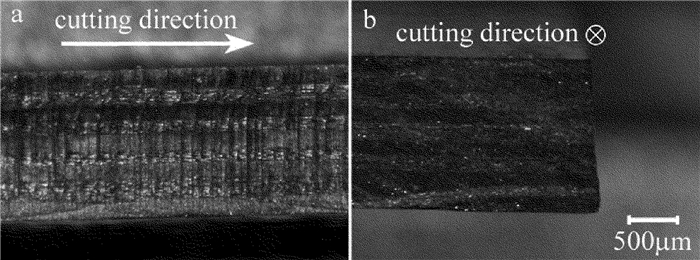 為了進一步探究切割質量,對切割后的切縫截面進行放大觀察,如圖 13所示。從圖 13a可以看出,切縫表面沒有纖維拔出現象及明顯的熱影響區,但是切縫表面略有不平整,這是因為激光能量在空間上服從高斯分布,同時在重復頻率比較低且掃描速率較快的工藝參量下切割,使得切縫表面不平整。從圖 13b可以看出,切縫有一定的錐角,這是因為即使掃描過程中采用了動態聚焦系統,掃描靠近切縫兩側的軌跡時,激光遮蔽效應仍無法避免,導致進入下表面的激光能量少,對材料的去除效果差,形成了上表面寬下表面窄的切縫,從而切縫產生錐角。