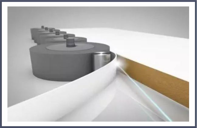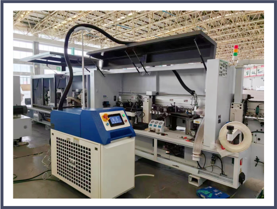 激光封邊: 通過將高能量的激光束聚合到激光封邊帶上, 高能量的激光快速融化封邊帶 的功能層, 然后通過壓輪機構, 將邊帶壓緊在工件上, 再經過截斷、初修、精修、跟蹤倒圓 等工序,從而實現封邊的目的。